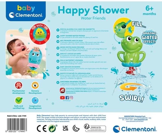 Set met twee grappige badspeeltjes van Clementoni. Vul de diertjes met water en draai voor een prachtig watereffect. Een leuke manier om kleintjes kennis te laten maken met water. Geschikt vanaf 6 maanden.