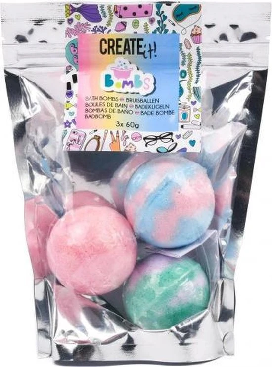 Create It! bruisballen Ga lekker in bad en neem deze bruisballen met je mee! De bruisballen geven een heerlijk zacht schuim en ruiken ook nog eens superlekker. In de verpakking zitten drie bruisballen, dus dat betekent meer dan voldoende badderplezier! Specificaties: Kleur: roze/groen/blauw Materiaal: zout/mineralen/olie Diameter: 4 cm Geslacht: meisjes Leeftijd: vanaf 4 jaar Inhoud: 3 Bruisballen 60 gram