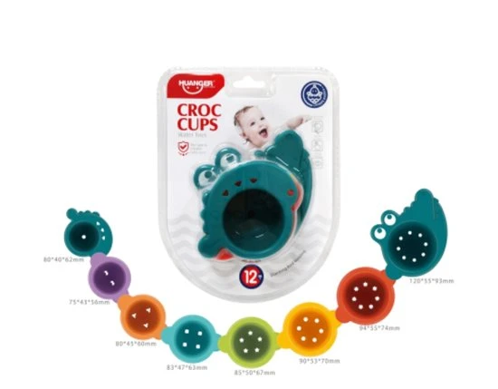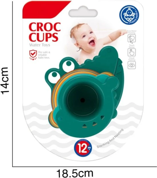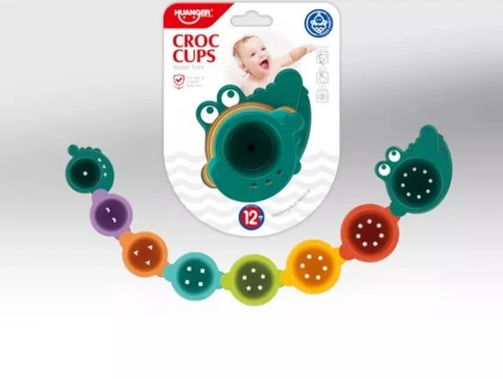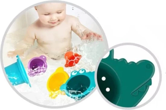 Super leuk Bad speelgoed voor de allerkleinste , totaal 8 cups met gaatjes , waar het water doorheen kan lopen daarbij kunnen de cups aan elkaar geklikt worden om zo een lange krokodil te maken of op elkaar stapelen.