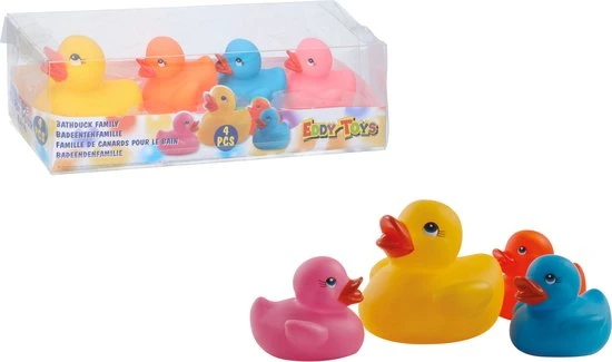 Rubber badeendjes gekleurd familie 4x stuks. In bad gaan wordt nog leuker met deze set van 4x verschillende gekleurde badeendjes. De badeendjes hebben een formaat van ongeveer 6 x 6 x 5 cm groot, de moeder eend is wat groter. Let op: de kleuren van de badeendjes kunnen afwijken van de afbeelding. Bad speeltjes.