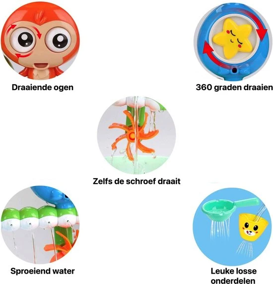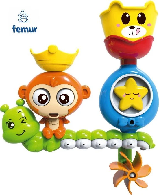 Dit badspeeltje is geen simpele eend in de bijt, nee dit speeltje kan namelijk bewegen. Vul het bakje met water, doe het water in het speeltje en de aap begint met zijn ogen te rollen en dan begint hij het water zo weer terug te spugen. Kijk ook eens naar de rups, door de kleine gaatjes die de rups heeft, komen er allemaal waterstralen uit hem. Super leuk!