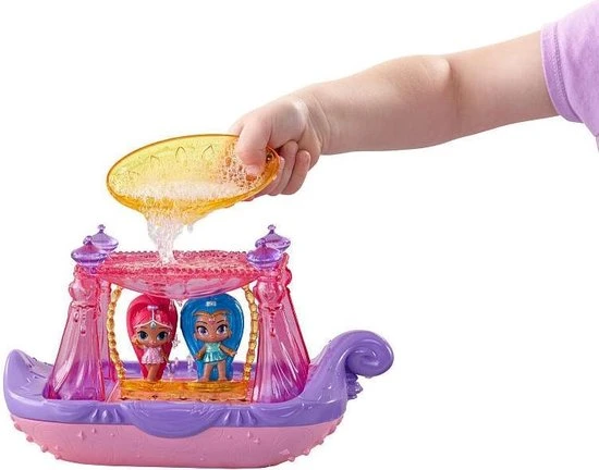 Neem deze echt drijvende geestjesboot mee in bad voor een vleugje magie. Deze adembenemend mooie gondel drijft echt in het bad en heeft een schommel aan boord voor Shimmer en Shine. Maak van het bovenste deel van de kap een minibootje voor de geestjes of gebruik het als een kopje dat je kunt vullen en leeggooien, waardoor de geestjes op hun dubbele schommel in een magische regenbui terechtkomen.