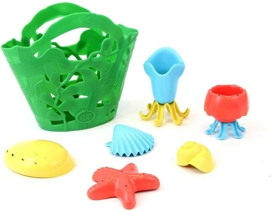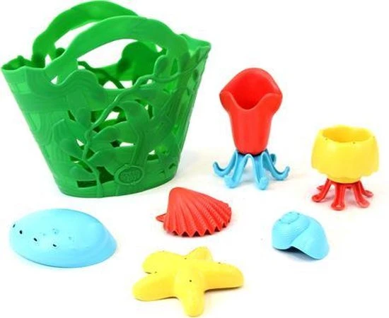 Btreng plezier en leren over getijdepoelen en spelen in de watertafel naar het bad. Deze 7-delige speelset bevat een zeester, sint jacobsschelp, zeeoor, zeeslak, inktvis en kwal, en er zit een leuke mand met zeewierpatroon bij.