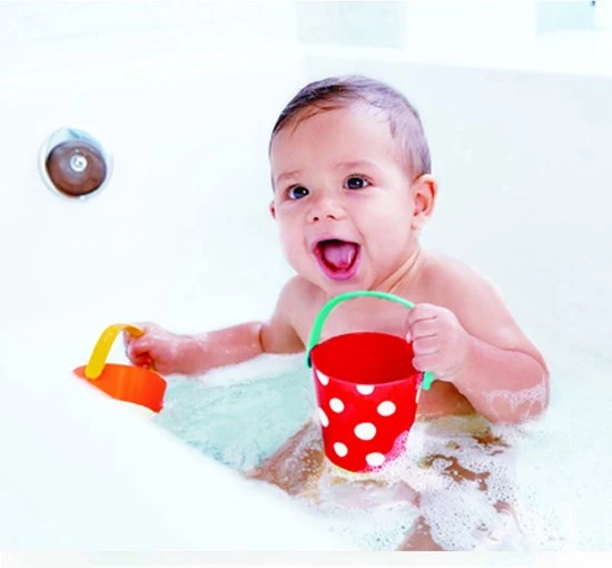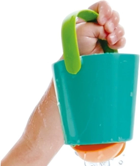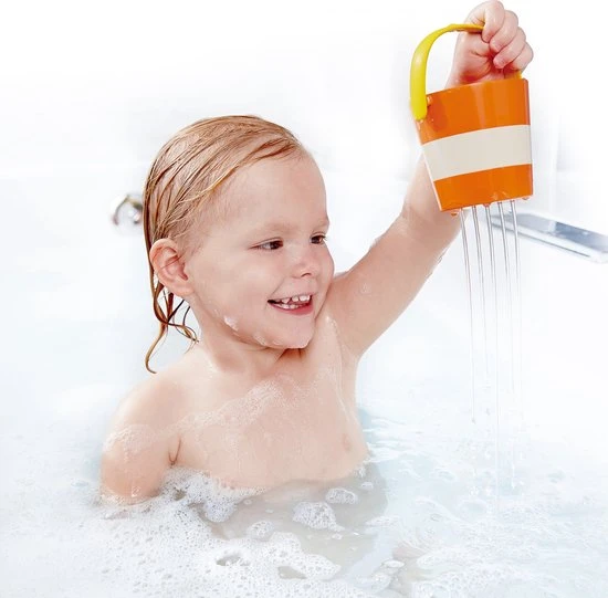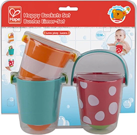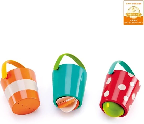 Drie kleurrijke emmertjes met verschillende waterafvoer voor leuke interactie. Perfect voor waterspel in bad!