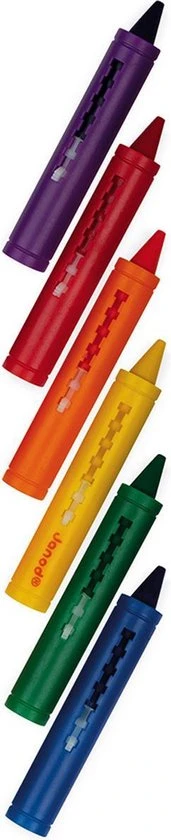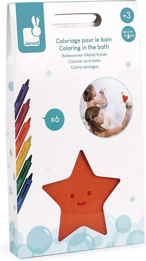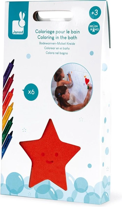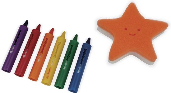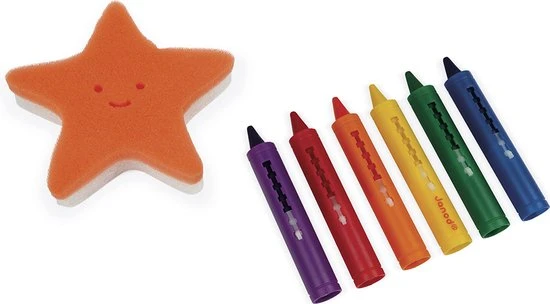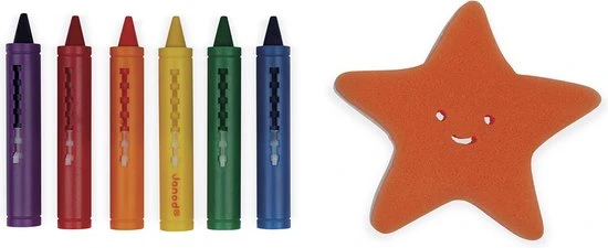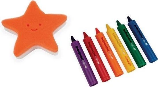 Kleuren in bad met 6 kleuren krijtjes! Met de spons in de vorm van een zeester kun je elke keer je tekening wissen en weer opnieuw beginnen.
