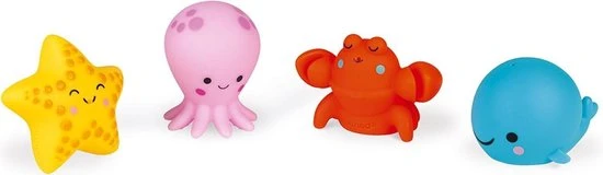 Voor kinderen van 10 maanden en ouder 4 dieren uit de zee: een octopus, een kreeft, een zeester, een walvis. Gemakkelijk om vast te nemen, voor uren speelplezier in bad!