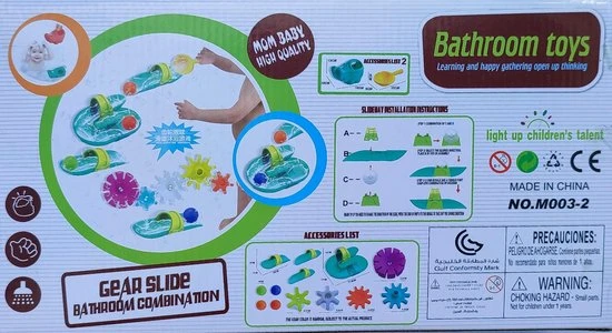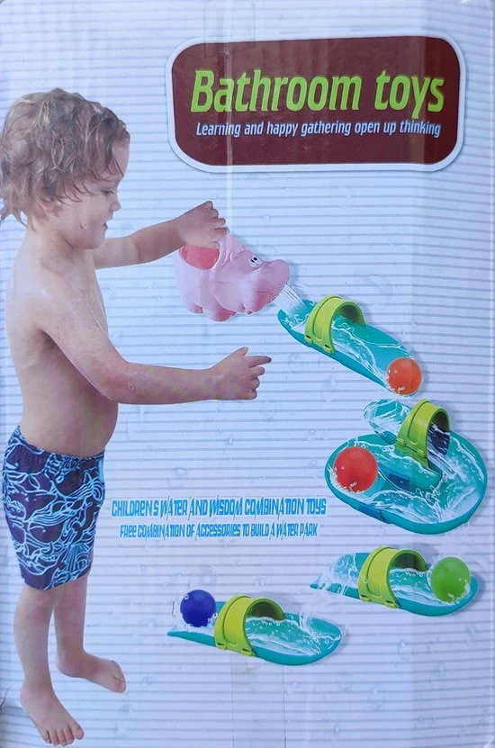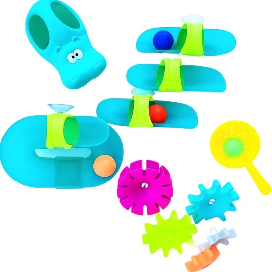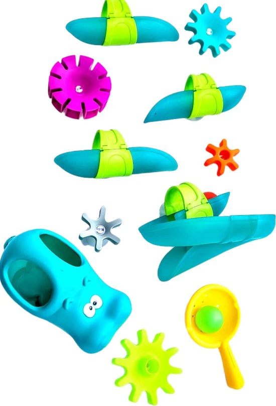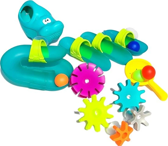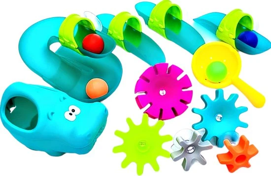 De waterbaan bestaat uit 4 glijbaan delen die telkens op een andere manier gecombineerd kunnen worden. Door de zuignappen is het makkelijk de onderdelen vast de plakken en te verplaatsen. Verder wordt de set geleverd met 5 verschillende waterratjes welke gaan draaien als er water doorheen stroomt. Laat het water stromen door de bijgeleverde nijlpaard gieter. Met het schepje vis je de ballen uit het water en laat je ze door de knikkerbaan rollen. Zeer complete speel set voor urenlang speelplezier!
