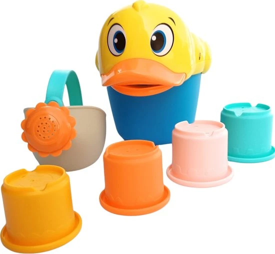 Super leuk speelsetje voor in bad of op zomerse warme dagen voor in het zwembadje! Gebruik de gieter om de verschillende emmertjes te vullen met water. Elk emmertje heeft een eigen patroon waaruit het water stroomt. Daarnaast zijn de emmertjes stapelbaar en maak je er een watertoren van. De badeend is te gebruiken als emmer en als gieter. Ook zeer geschikt als haarspoelbeker! Gegarandeerd waterpret voor meisjes en jongens!