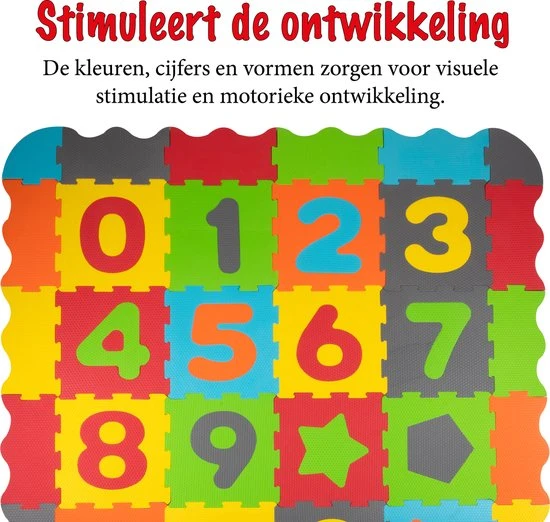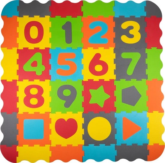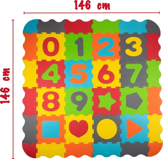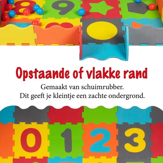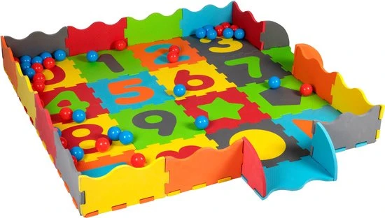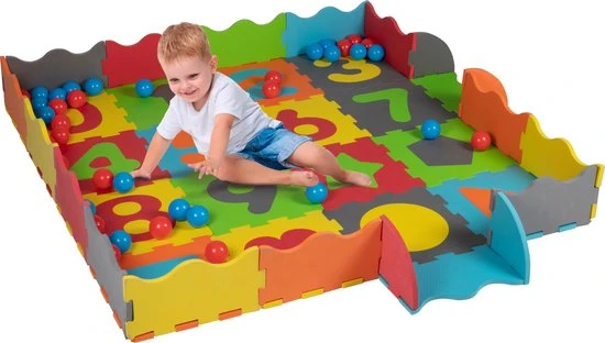 Deze grote speelset voor peuters is een combinatie van speelmat, puzzel en ballenbak. De mat is zo’n 146 x 146 centimeter groot en is gemaakt van schuimrubber. Dat vormt een zachte ondergrond voor je kleintje. De speelmat bestaat uit kleurrijke puzzelstukken, deels met cijfers en vormen, die eruit kunnen. Zo kun je ook echt puzzelen met deze mat. Bij de set zitten verder maar liefst 40 speelballen. De rode en blauwe ballen hebben een doorsnee van zo’n 6 centimeter en zijn dus groot genoeg voor kleintjes om mee te spelen.