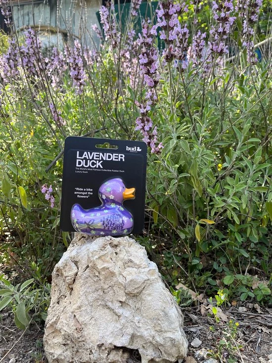Budduck Lavender Duck , 12 cm badeend in blisterverpakking…. kijk naar deze prachtige lavendel thema badeend en sluit je ogen ….. voel de warme zomerdagen rijdend op een fiets langs de prachtige en geurende lavendelvelden in de Provence…. onvergetelijk voor de zintuigen…