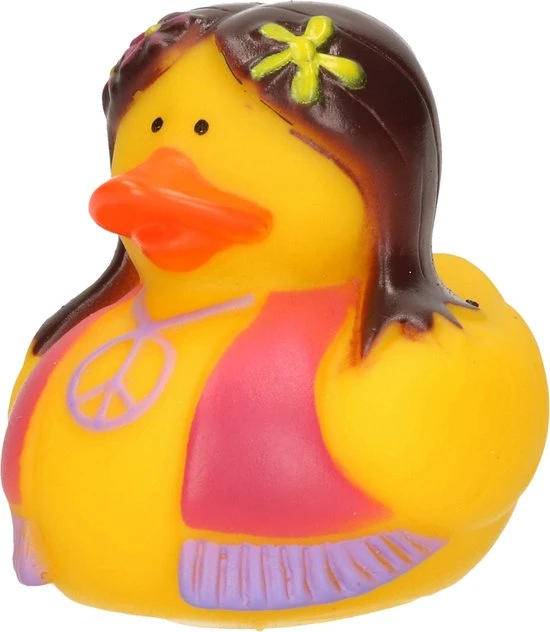 Badeendje flower power hippie geel met roze/paars vestje 5 cm. Dit gele rubberen badeendje is verkleed als hippie met roze vestje, een paarse ketting met het vredesteken en een hippie hoofdband.
