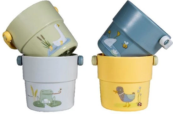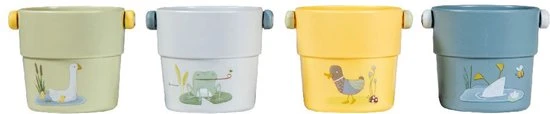 Stapelen, vullen, gieten en SPLASH! Je kleintje zal extra genieten tijdens het badderen met deze set van 4 badbekers. Ze zijn er in 4 kleuren en zijn versierd met illustraties Little Goose en zijn vrienden. De maat is precies goed voor kleine handjes en spelen met de kleine emmertjes helpt bij de ontwikkeling van motorische vaardigheden. Stapel ze op elkaar om een ​​grote toren te bouwen en omver te werpen. Of vul ze met water en zie er verschillende vormen uitstromen. Spetters en plezier gegarandeerd! Verpakt in een full-colour windowbox. Geschikt voor kinderen vanaf 18 maanden.