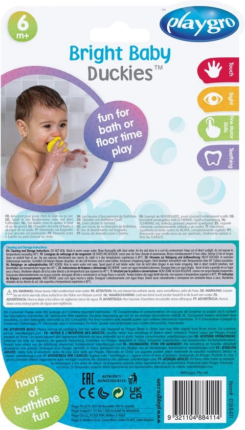 Rub-a-Dub-Dub. De drie schattige drijvende eendjes van Playgro zijn volledig afgesloten om schimmel te voorkomen en volkomen veilig voor je baby om op te kauwen. Felle kleuren zorgen voor de visuele stimulatie. Ze hebben een perfect formaat voor kleine handen. Deze eendjes brengen plezier en verbeelding tijdens badtijd naar voren.