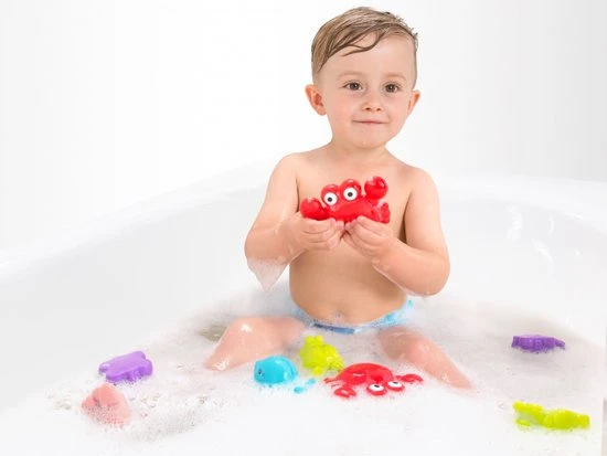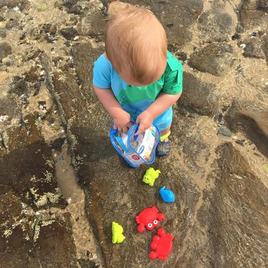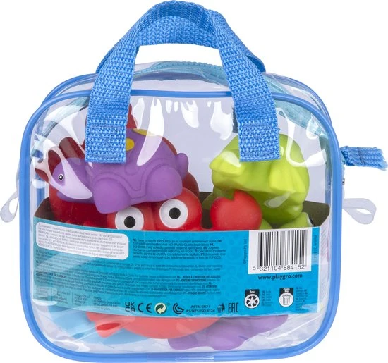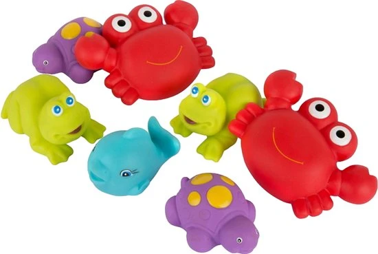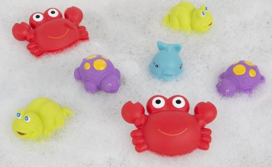 De diertjes zijn verpakt in een handige tas waardoor ze na het baden kunnen worden opgeborgen. Super handig! Met welk zeevriendje gaat jouw kleintje als eerst spelen? De rode krab, de groene kikker, de paarse schildpad of toch het blauwe dolfijntje? De badspeeltjes zijn geschikt voor kindjes vanaf 6 maanden.