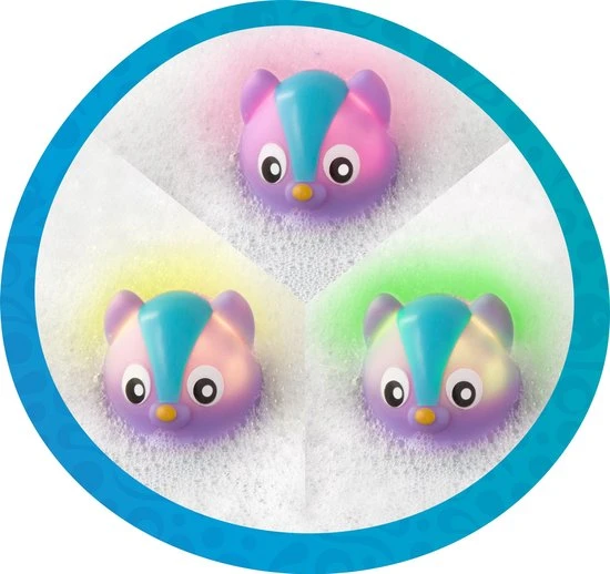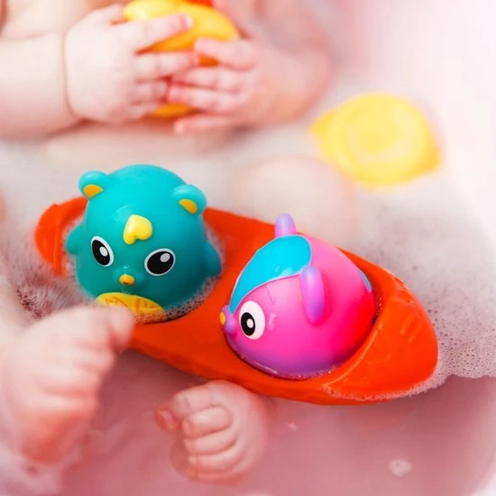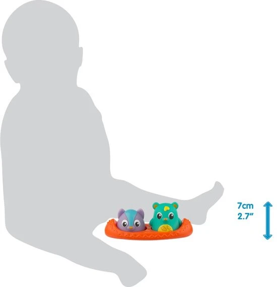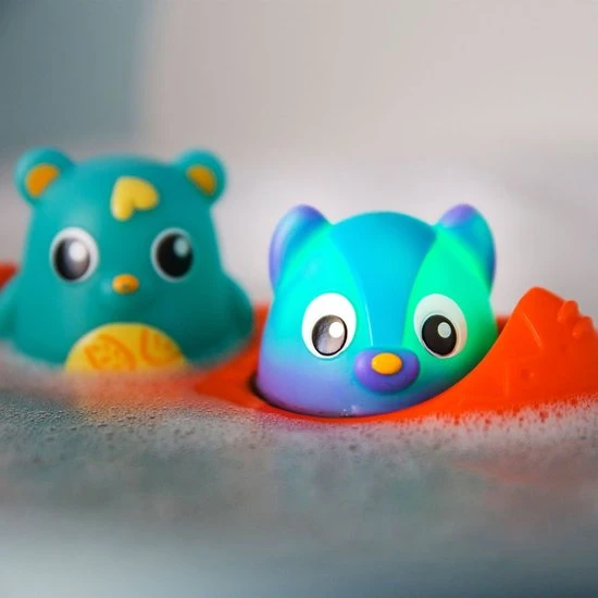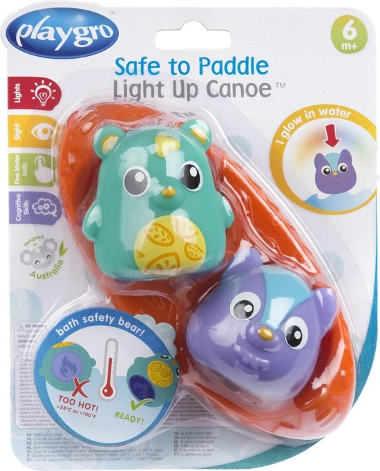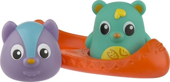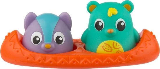 Deze kanovriendjes combineren speelplezier en veiligheid samen in bad. De beer heeft een handige warmtegevoelige indicator die van kleur verandert wanneer het water te heet is! De wasbeer gloeit op met 3 roterende kleuren om de visuele zintuigen van de baby aan te spreken. Samen dobberen ze in de kano of ze kunnen eenvoudig verwijderd worden voor fantasierijke speelavonturen. Alle speeltjes zijn perfect voor kleine handjes en moedigen de baby aan om hun wateromgeving te verkennen.