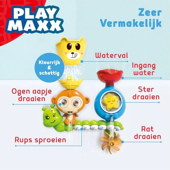 PlayMaxx badspeelgoed bestaat uit meerdere onderdelen die beginnen te draaien op het moment dat jij of je kind er water aan toevoegt. Draaiende onderdelen zijn de ogen van een aapje, een glimlachende ster en een watermolen.