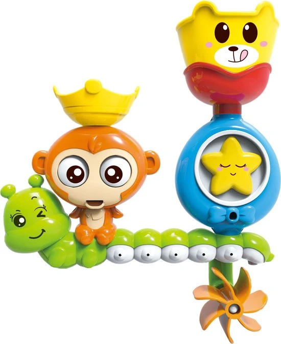 Naast bewegende onderdelen ziet je kleine meerdere waterstralen bij het toevoegen van water aan het bad speelgoed. Een waterstraal komt uit het mondje van het aapje en meerdere waterstralen komen uit de rups.