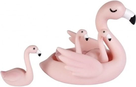 4 delige badspeeltjes set flamingo. Roze drijvende flamingo voor in bad, met drie kleine flamingootjes. De grote flamingo heeft een lengte van ca 16 cm. Badspeelgoed voor kinderen en baby’s.