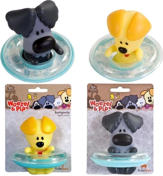 Woezel en Pip badfiguur, voorzien van drijfring. Flexibel kunststof, gemakkelijk af te drogen na het badderen. Wordt 2 assorti geleverd: kies uit Woezel of Pip, maar leuker nog is allebei! Verpakt op een blisterkaart. Geschikt voor kinderen vanaf 12 maanden.