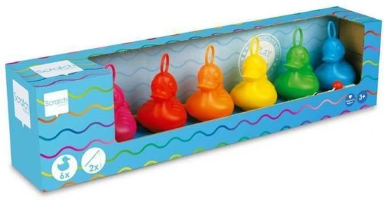 De kleuren van de eendjes zijn roze, rood, oranje, geel, groen en blauw