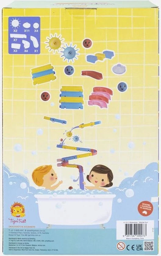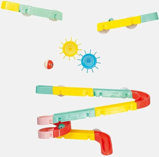 Bouw de knkikkerbaan, laat de knikkers bovenaan los en kijk hoe ze de baan af racen. Dit badspeelgoed bestaat uit 21 onderdelen die op verschillende manieren gecombineerd kunnen worden, met telkens een ander spectaculair resultaat.