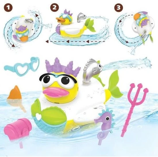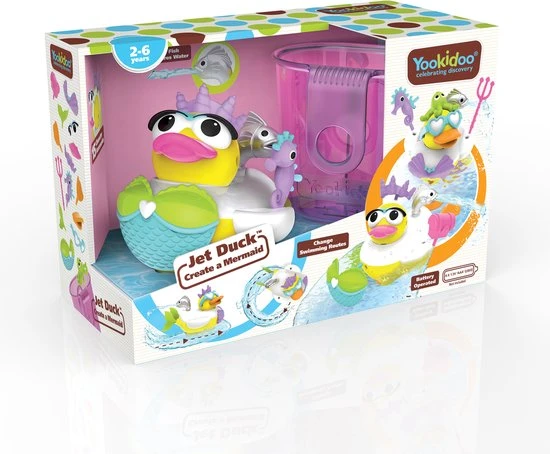Wanneer je kindje haar aan zet dan begint ze te zwemmen. Je kindje kan het eendje sturen door het waterkanon te draaien. Het waterkanon werkt dus als een stuwmotor en zo racet de Mermaid Duck door het bad heen. Kan je kindje hem weer vangen? Het water wordt uit het bad aangezogen aan de onderkant van het eendje en komt door het waterkanon weer naar buiten. Er moet minimaal 10 cm water in het bad zitten om de Yookidoo Mermaid Duck te laten werken.